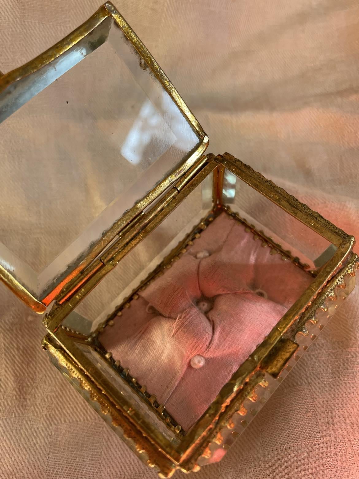 A small rectangular glass jewellery/trinket/ casket box . Intricate gilt bronze frame and thick bevelled glass sides. Original pink silk cushion