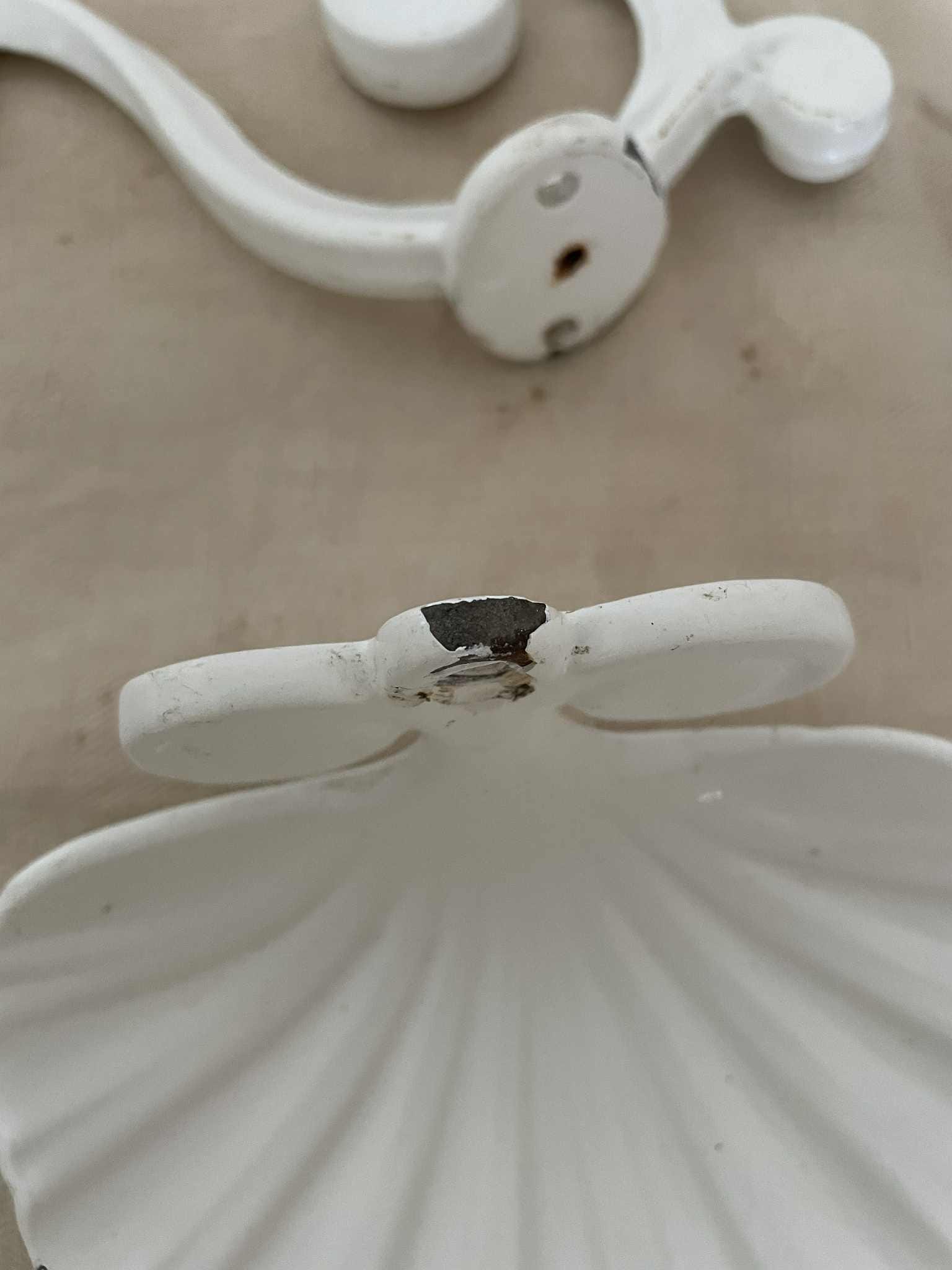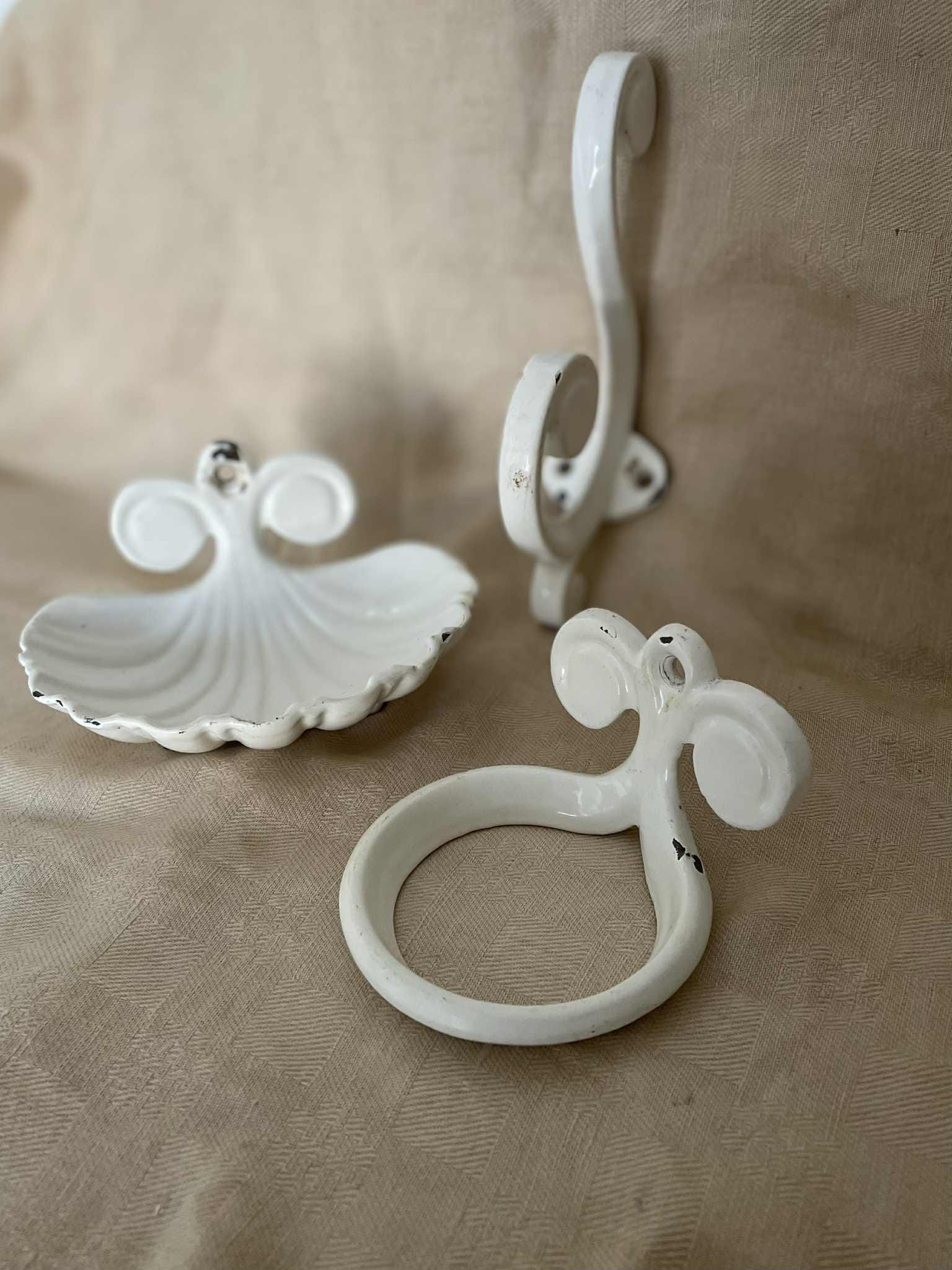 Vintage cast iron enamelled scallop shell Soap dish, bathroom hook and glass holder