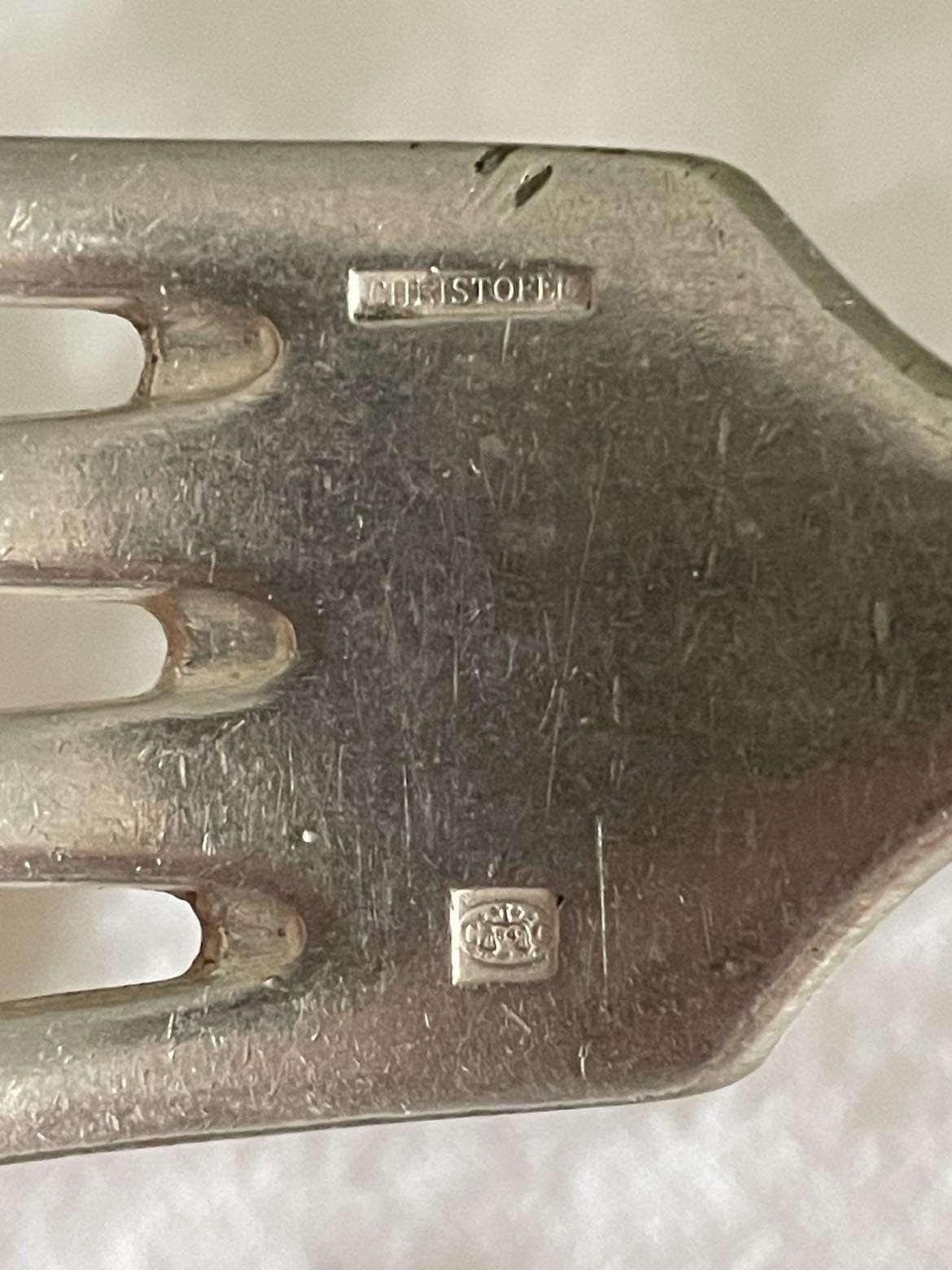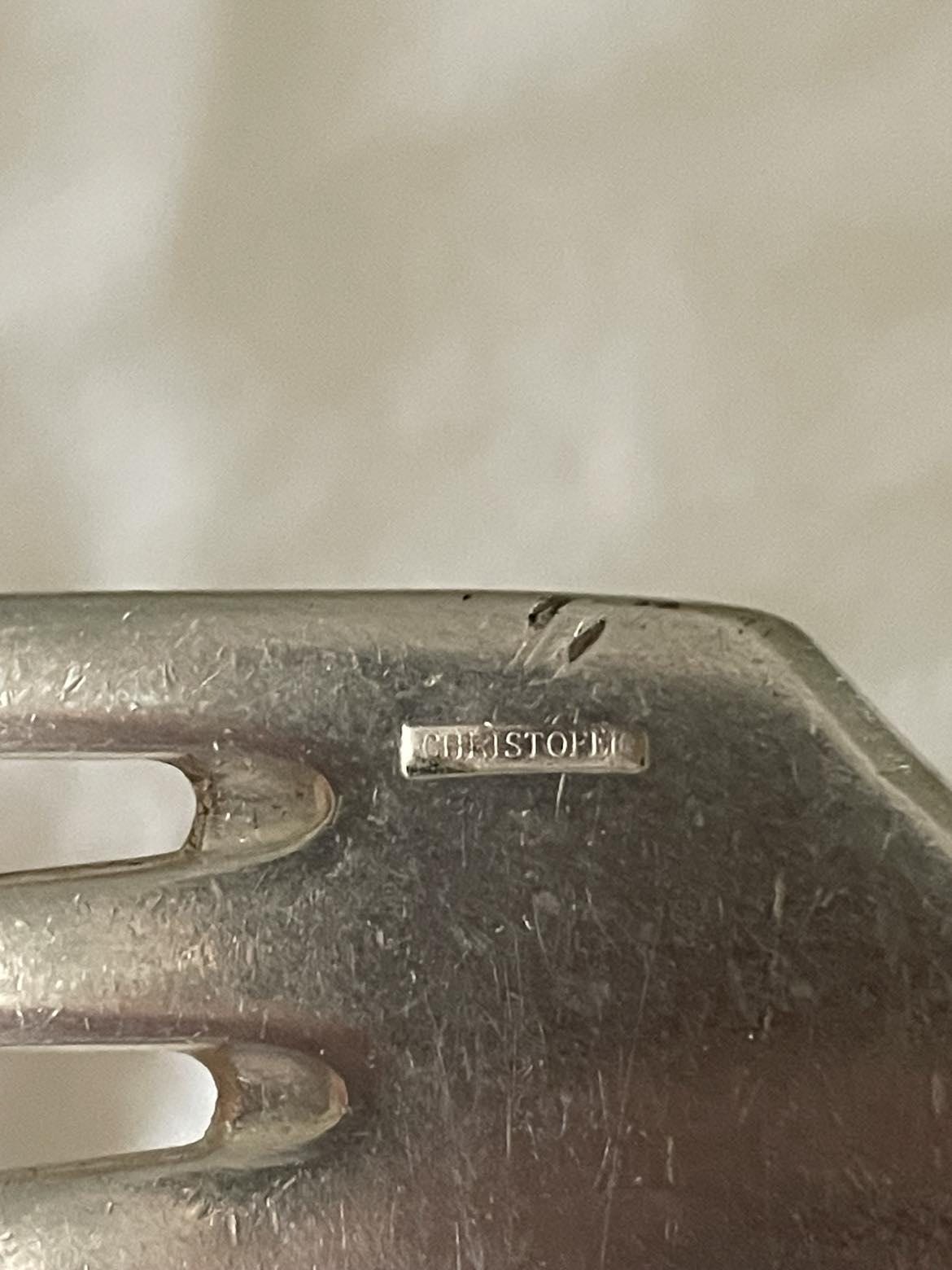 Marked on the front of the fork and bowl of spoon with the silversmiths mark and name Christofle