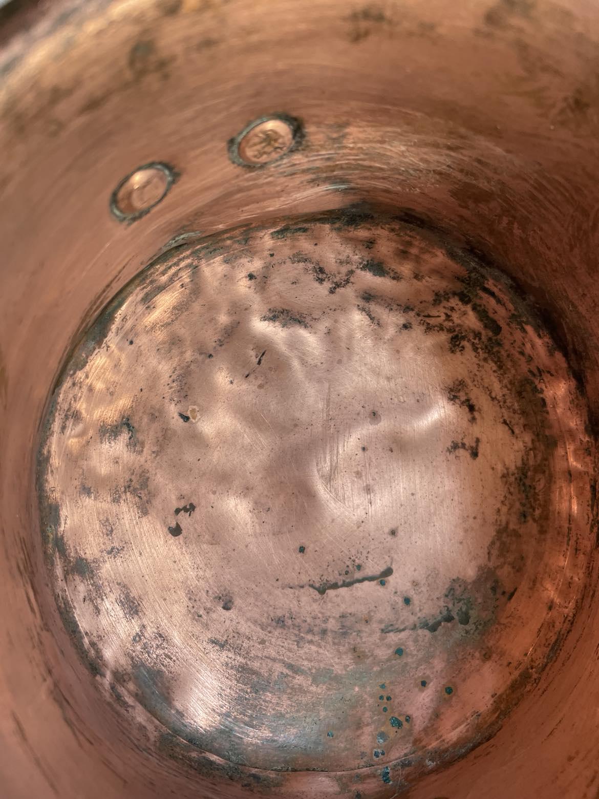 This appears to be hand crafted from a single piece of copper, it has a rolled edge and copper rivets. The long black iron handle is hand forged