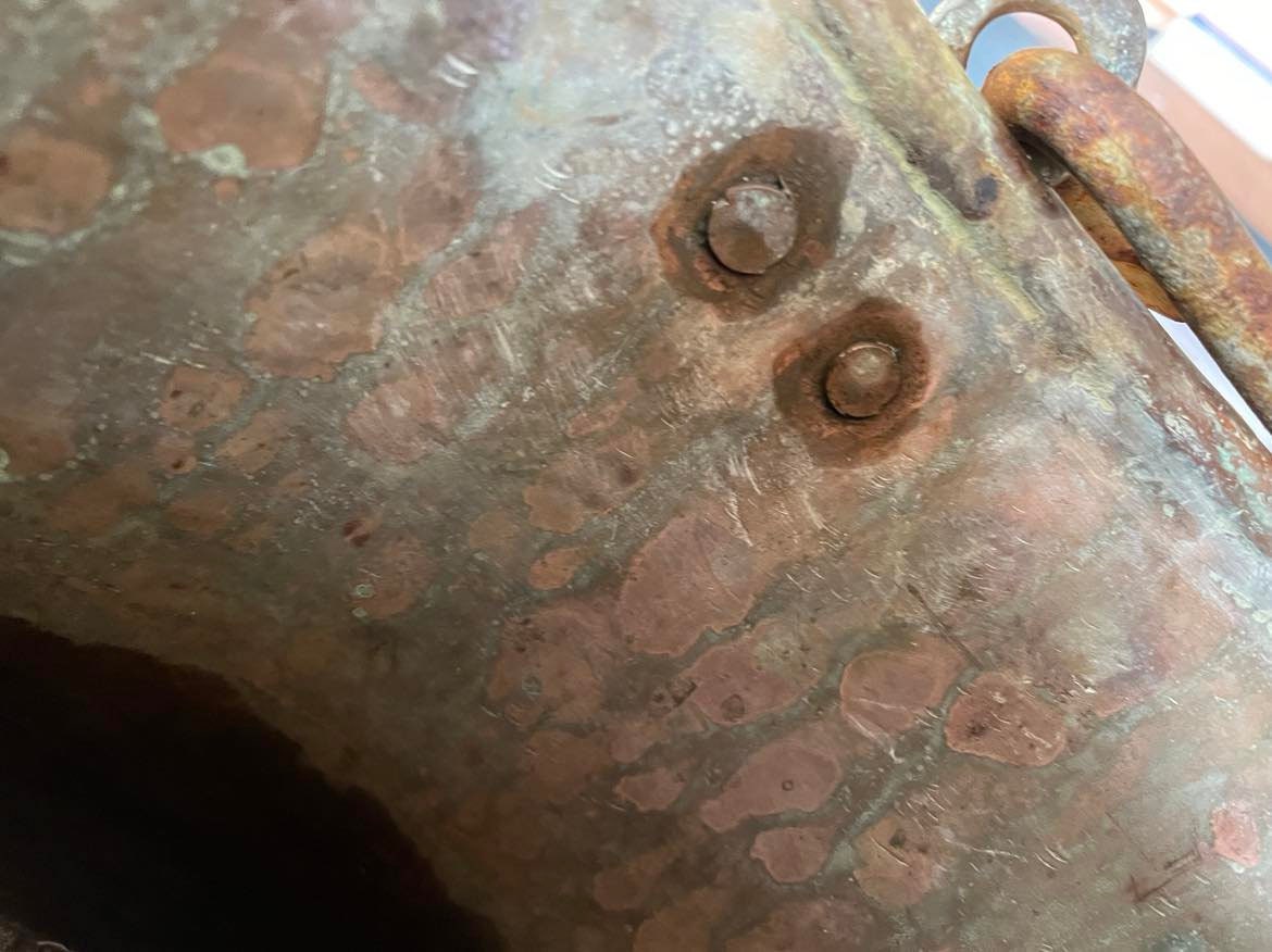 Dovetail seams to side and base. Rolled copper rim, slightly dented in places, with a forged iron handle; attatched to the pot either side with copper rivets and brass plates.