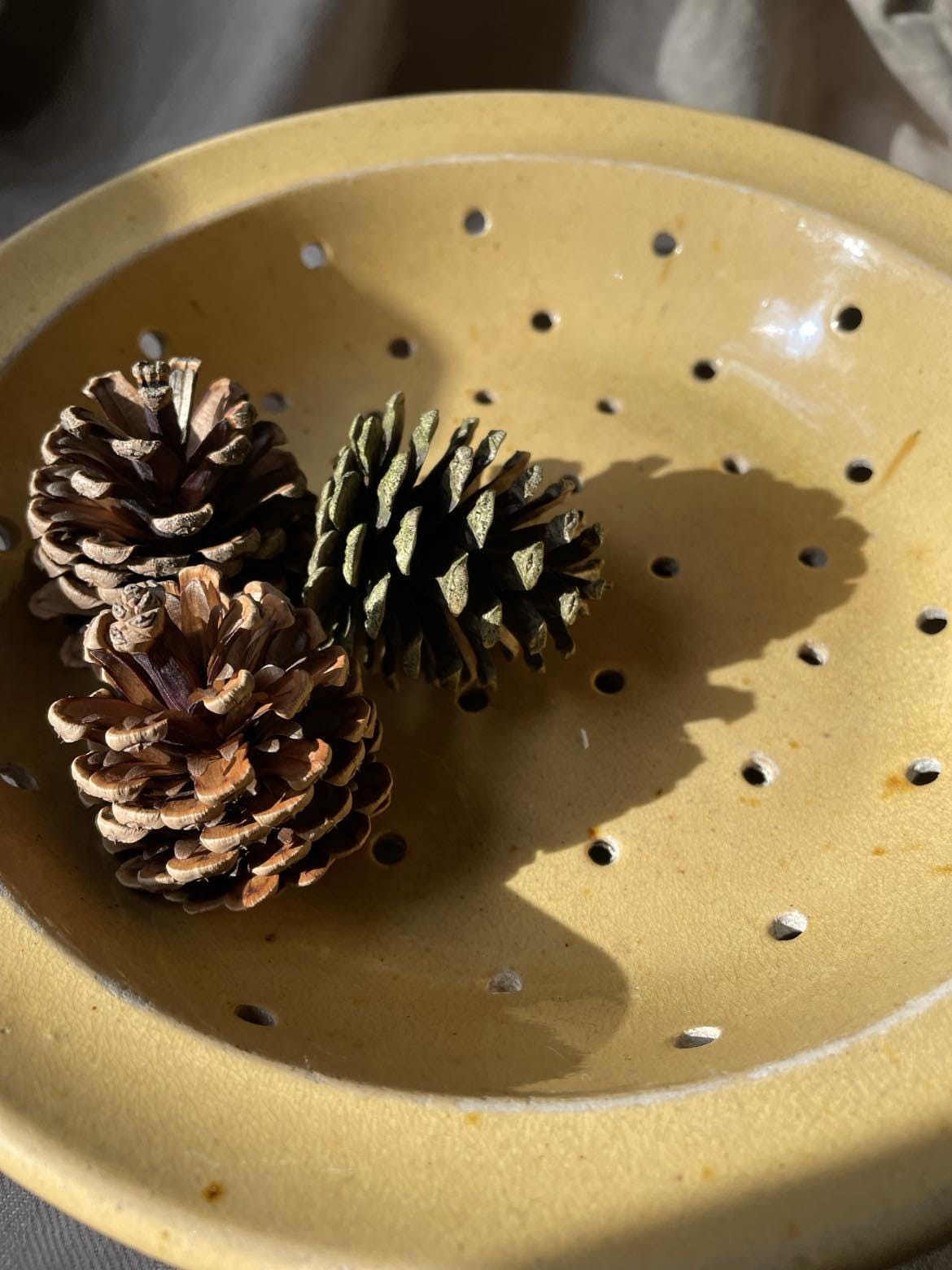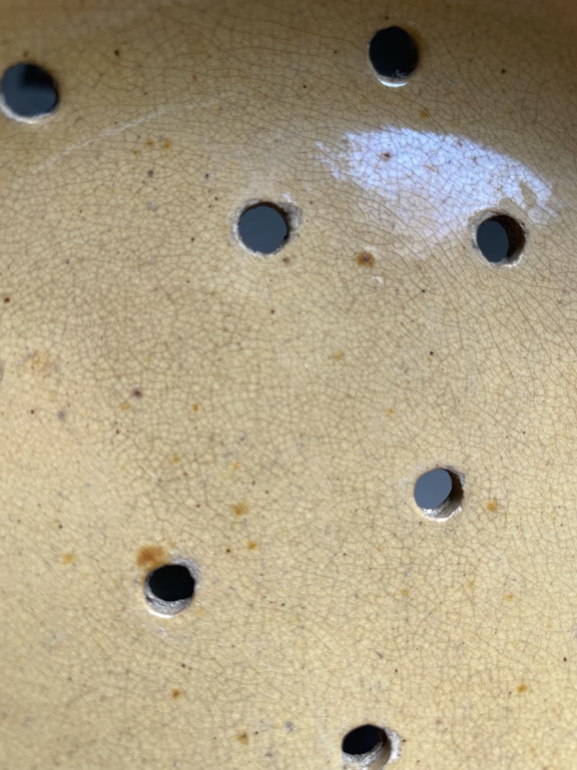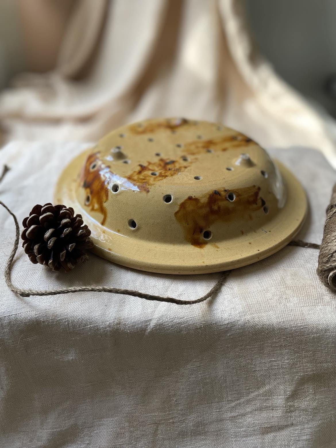 Antique Faisselle in glazed earthenware. Rustic French pottery - primitive draining sieve for making cheese of the same name -faiselle (made with raw milk ) Stands slightly off the ground to allow the curds to seperate from the whey