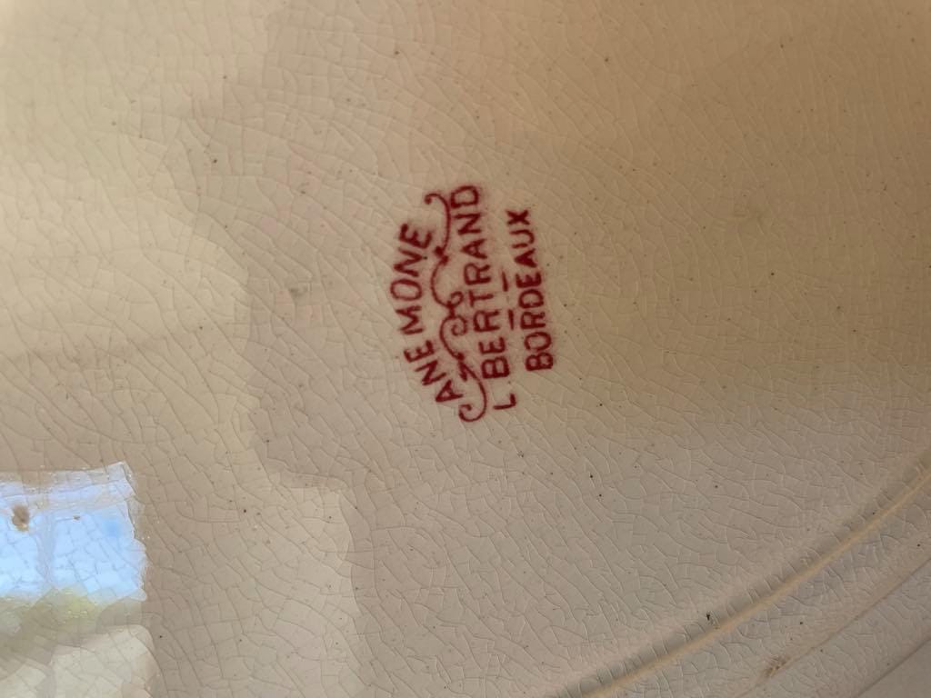 An Oval ironstone serving plate with a Raspberry red transferware print manufactured by Faiencerie Bertrand in Bordeaux in the early 1900's