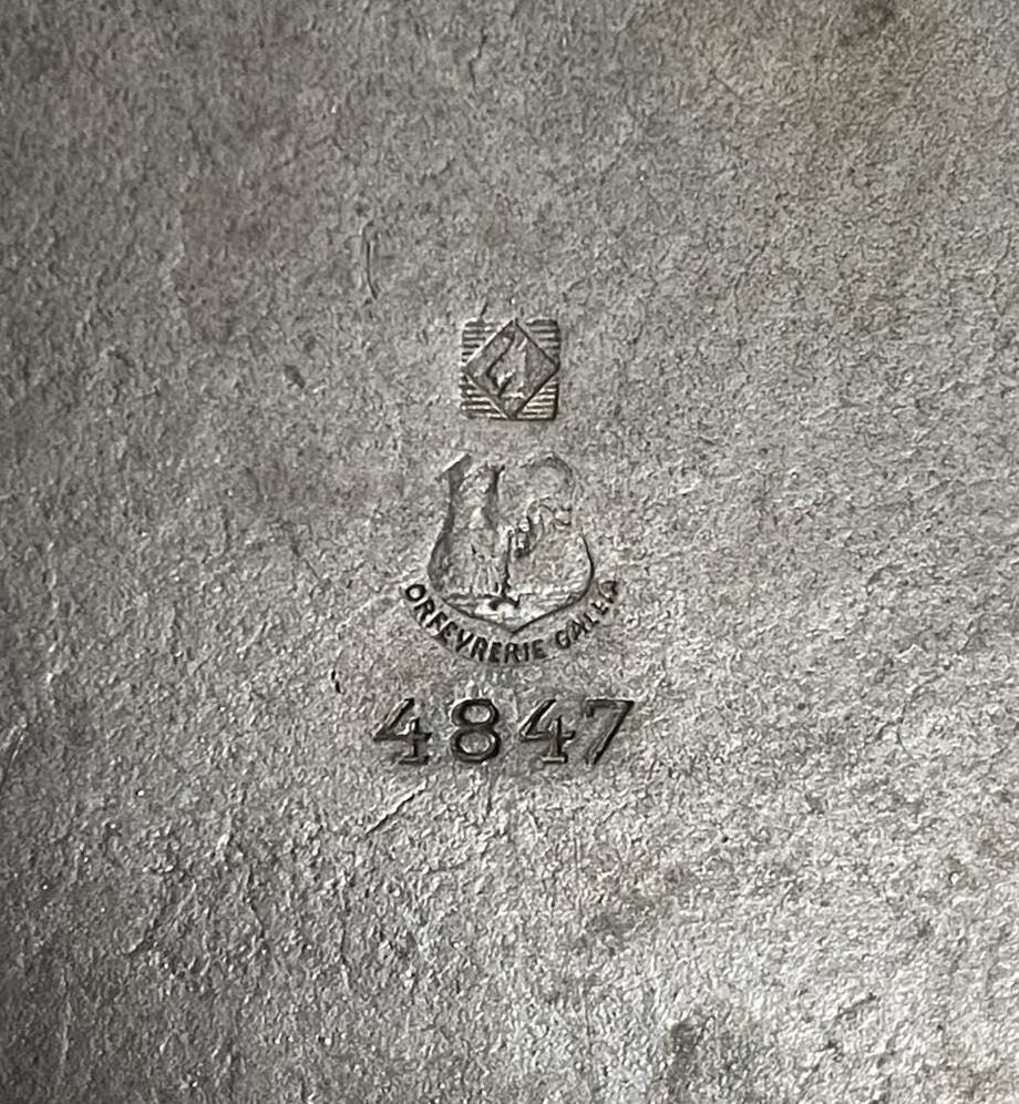 The mark to the base shows the manufacture de l'Alfenide mark for silver plating used by Christofle between 1908 and 1929 ( the head of a goat in a rhombus in a hatched rectangle) , the christofle Gallia Cockeral and a model number 4847