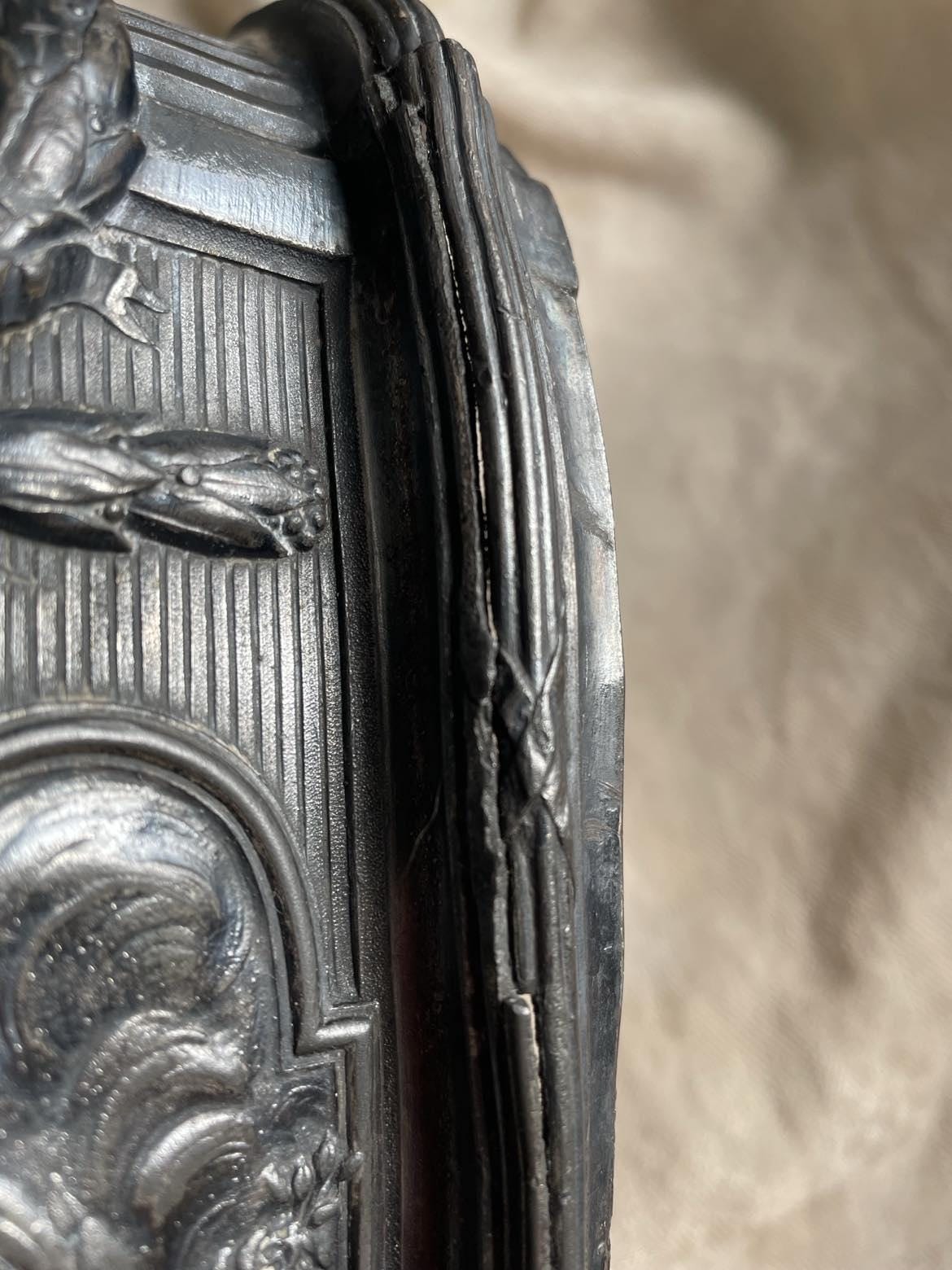 It is tarnished and has unfortunately sustained some damage to its surround. - please see final photos. There is no glass liner.