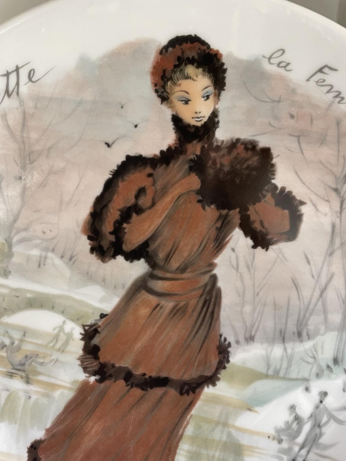 A D'Arceau-Limoges porcelain first edition plates - from a series "Les femmes du Siecle"- women of the century comissioned by the Chambre Syndicale de la Couture Parisienne. Limited edition numbered and signed based on an original illustration by FR. GANEAU 1976