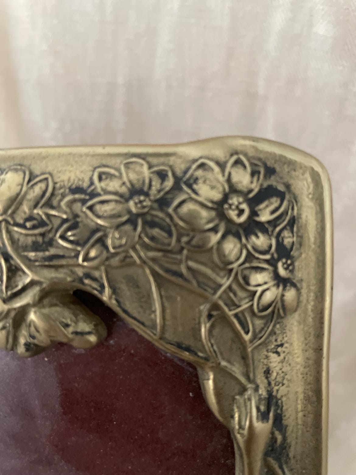 A heavy Solid brass table top photograph frame in an art nouveau style. Made in 50/60's, the frame features a lady slightly elevated from the border, looking into the glass. It has a red velvet effect backing