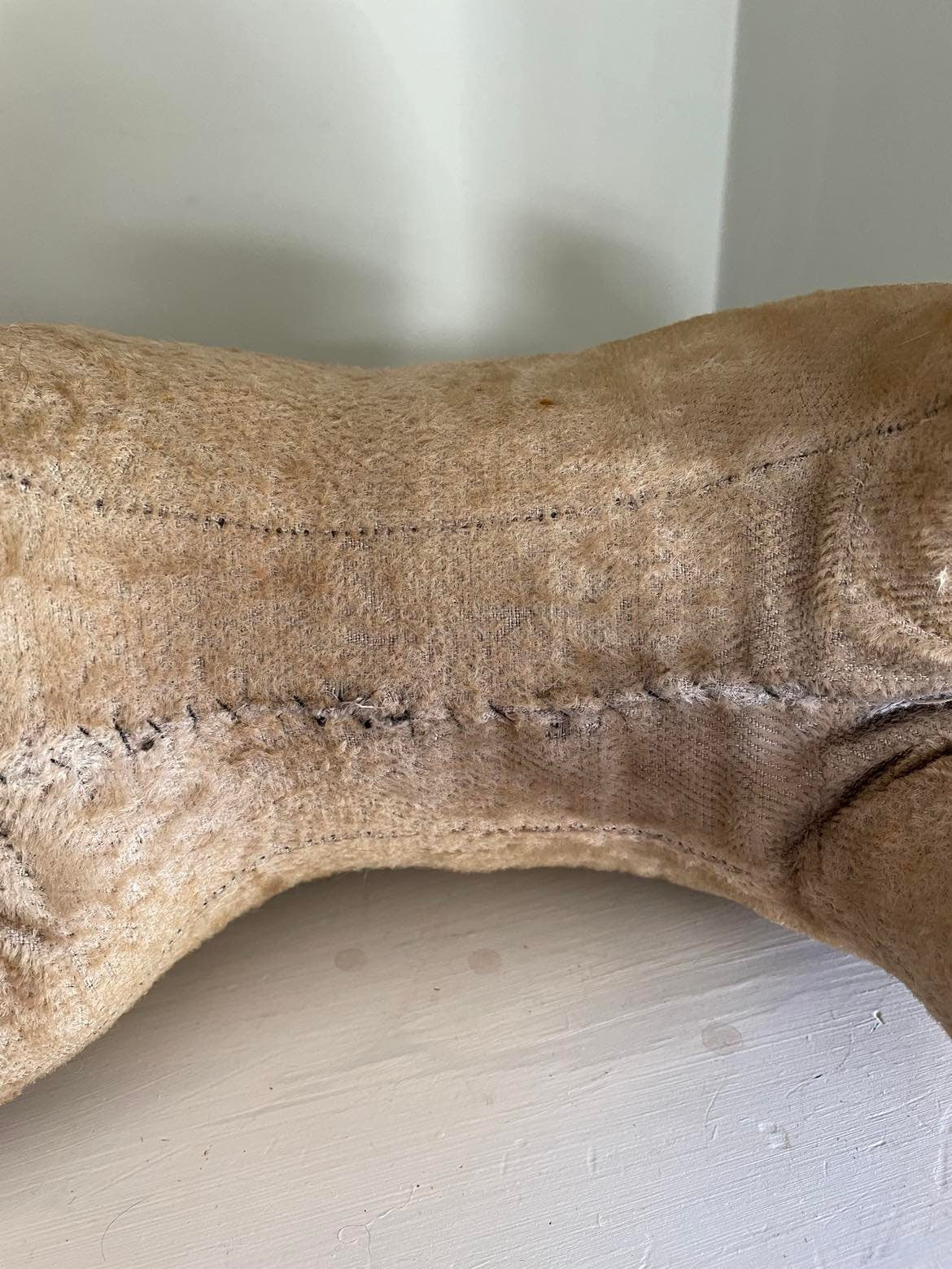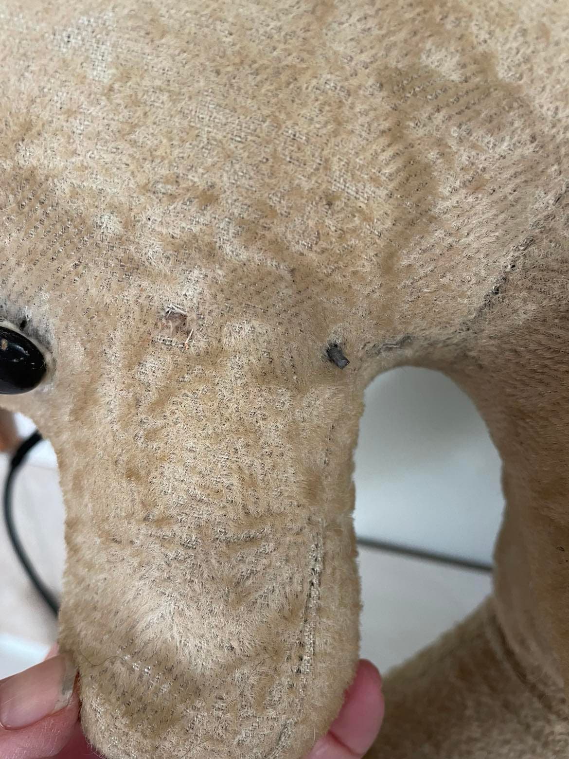 Unfortunately it has lost support in the front left leg and so does not easily stand tall. Evidence of repair stitching in places . One ear has been sewn back on. Slightly stained particulary around the hooves - In original found state - It has not been cleaned