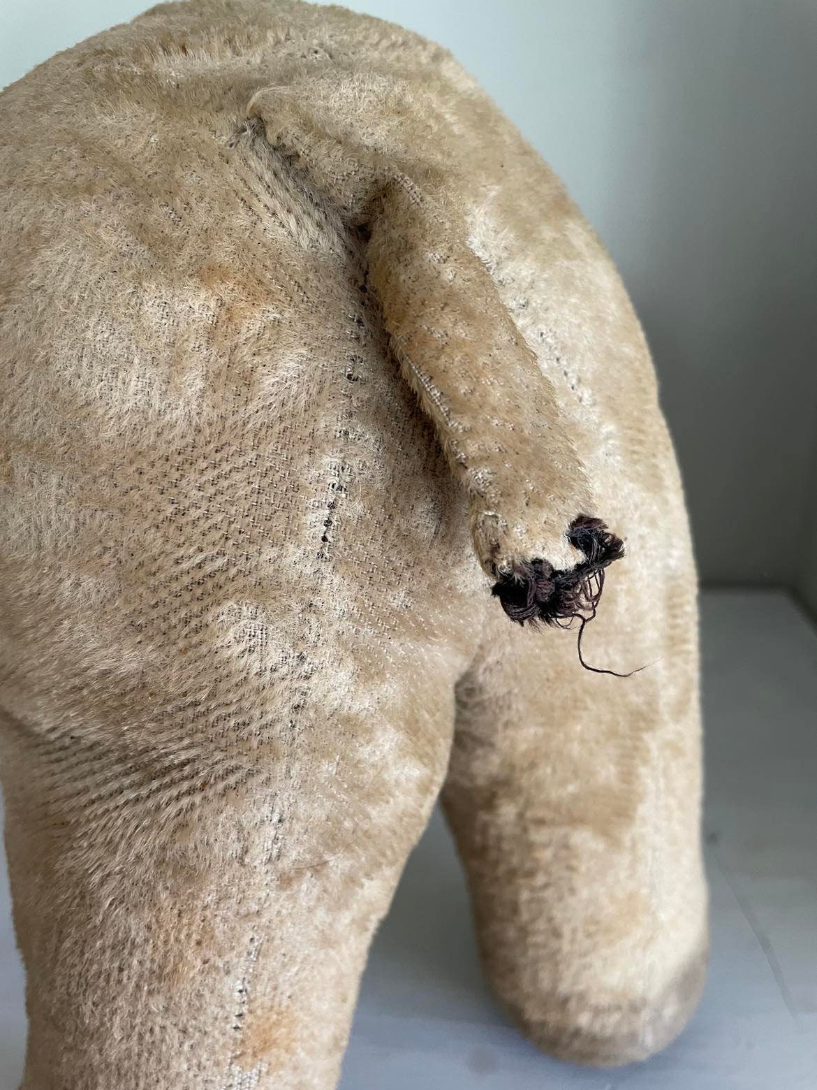 The body is stuffed with wood wool, the fabric, which is worn in places, was once plush (mohair? ). The eyes were originally wooden beads. One has been replaced with a button. The nostrils are hand drawn . Wire framed - some wire visible in the neck area ( NOT suitable as a toy)