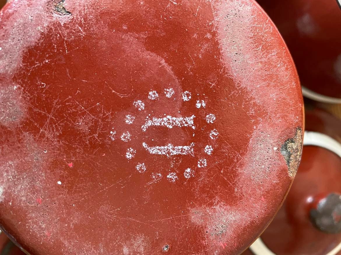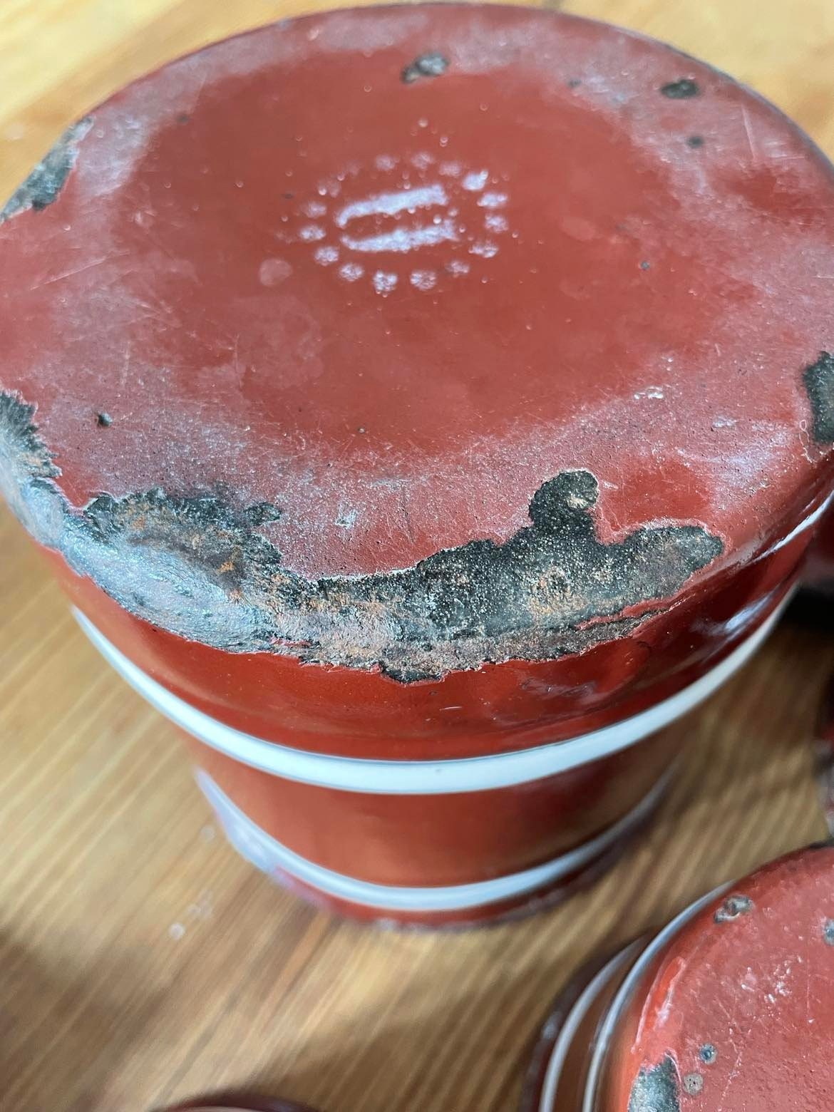 Vibrant burgundy colour with a white stripe. They have been well used and there are chips to the enamel in places. The inner rim of the lids of Café and Sucre have been displaced. ( please see photo)