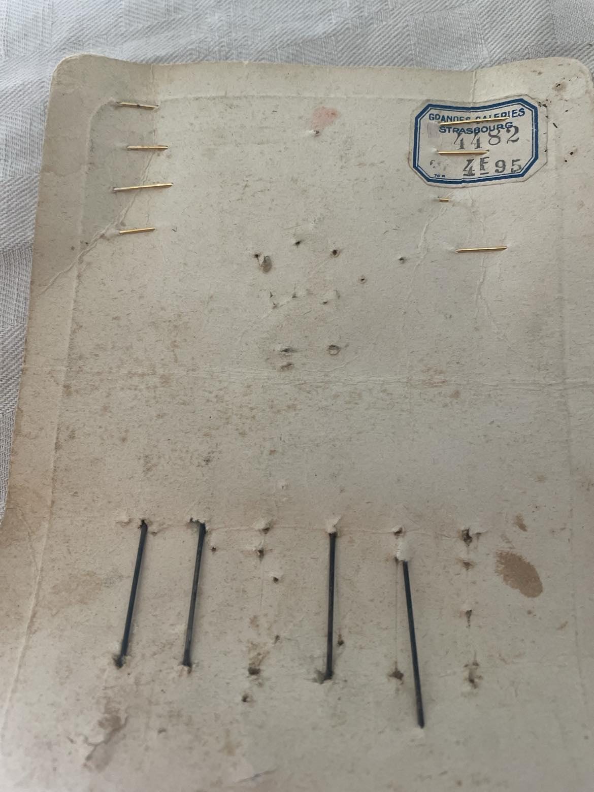 The 4cm pins are in very good condition, but there is tarnishing to the other sizes. The backing card is bent in places and slightly discoloured