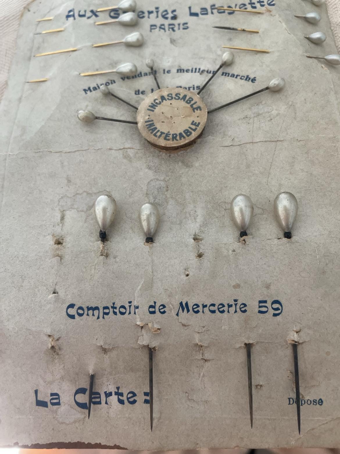 A set of teardrop faux pearl hatpins circa 1900 from Aux Galeries Lafayette, ( the original store) Paris