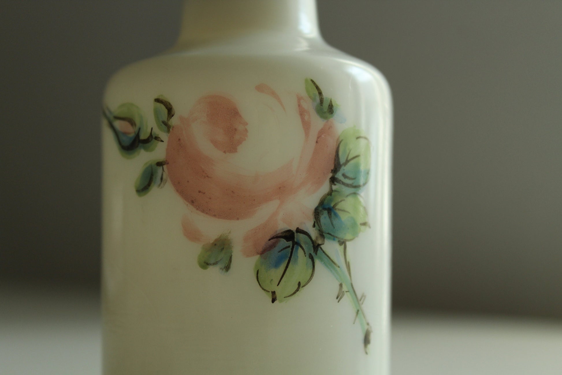A vintage hand painted opaline glass perfume bottle with a single rose design to the front and leaf to rear